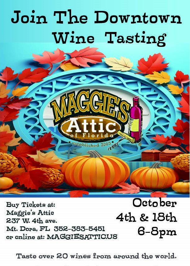Join us at Maggie's any day of the week and indulge yourself in our selection of over 400 wines and 200 craft beers, many by the glass. Be sure to join us twice each month as we host a wine tasting featuring over 20 different wines, with a stroll though the streets of Historic Downtown Mount Dora, enjoy live music and more. If you're the beer enthusiast, don't miss our monthly craft beer tasting event. Need a one-of-a-kind gift? You will be impressed with our selection of great eclectic gifts and many unique wine & beer specialty items, PLUS don't forget our wine/beer club options make a great gift. We also have GIFT cards, visit or online store. |